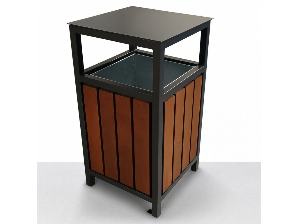 Moderný vonkajší odpadkový kôš v odtieni vlašský orech je vhodný do všetkých vonkajších aj vnútorných priestorov.